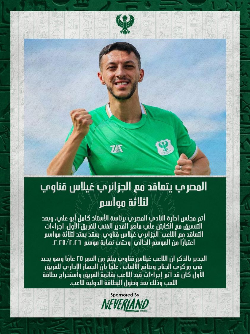 أعلن النادي المصري عن التعاقد مع اللاعب الجزائري غيلاس قناوي لـ 3 مواسم في بيان له عبر الصفحة الرسمية على “الفايسبوك”.