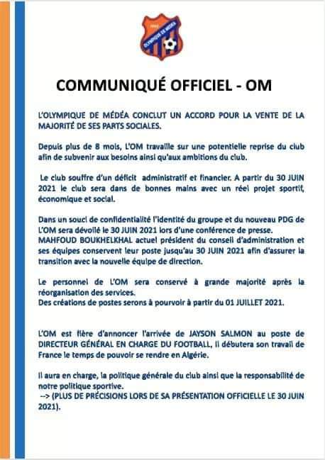 أعلنت بصفة رسمية اليوم الأربعاء إدارة  أولمبي المدية  عن بيع الفريق لشركة جديدة لم تكشف عن إسمها.