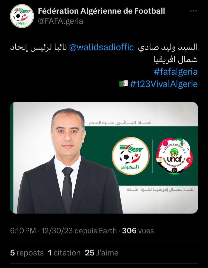 وكان رئيس الفاف وليد صادي قد ترشح لنيابة رئاسة إتحاد شمال إفريقيا، حيث نجح في اثبات نفسه على المستوى الإفريقي في أول مسؤولية يفوز بها، على أمل تمثيل الإتحاد الشمال الإفريقي جيدا بشكل عام والجزائر بشكل خاص.