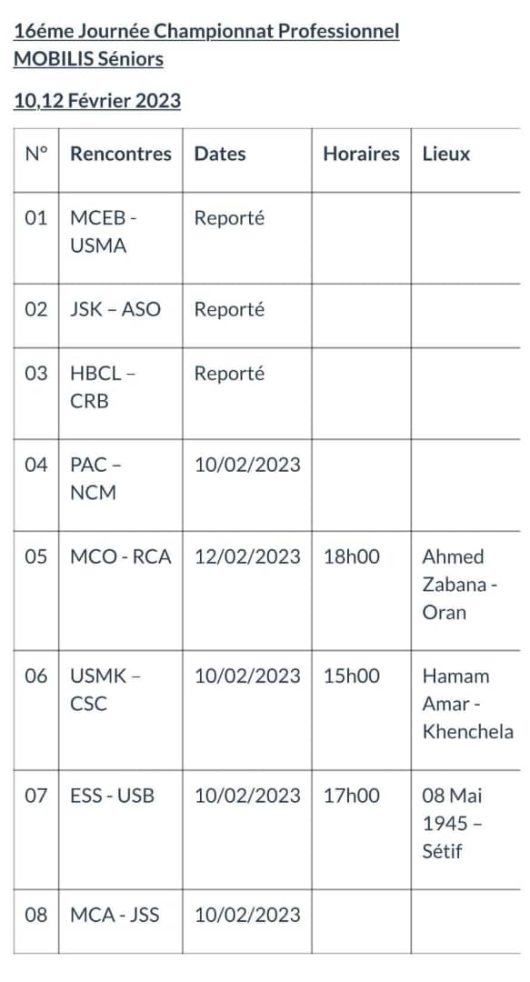 الجولة الـ16: الجمعة 10 والأحد 12 فيفري 2023.