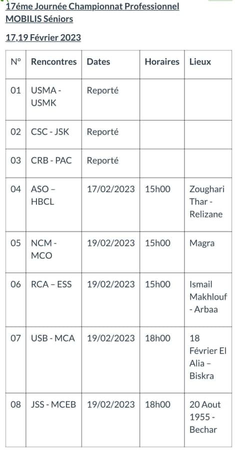الجولة الـ17: الجمعة 17 والأحد 19 فيفري 2023.