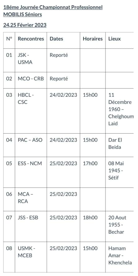 الجولة الـ18: الجمعة 24 والسبت 25 فيفري 2023.
