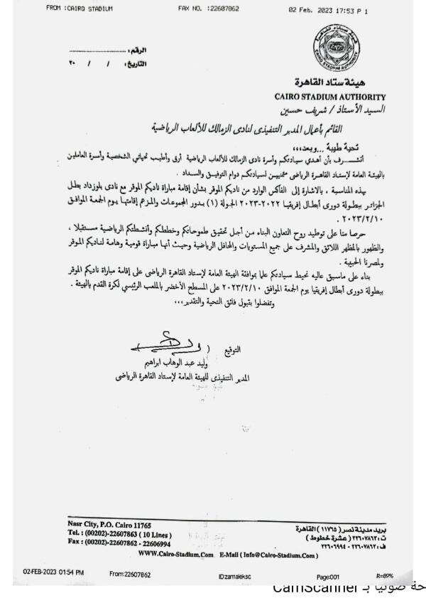 حيث تقدم مجلس إدارة الزمالك، بالشكر إلى أشرف صبحي وزير الرياضة، ووليد عبد الوهاب المدير التنفيذي لملعب القاهرة، على الاستجابة لطلبهم.