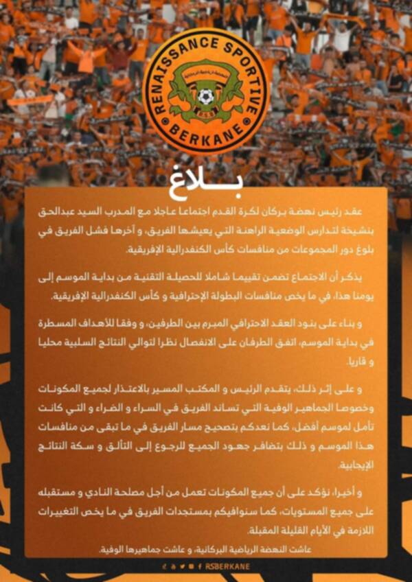 حيث قرر مجلس إدارة نهضة بركان الانفصال عن “الجينرال” بعد الإقصاء من كأس الكونفيدرالية الإفريقية أمام الاتحاد المنستيري.