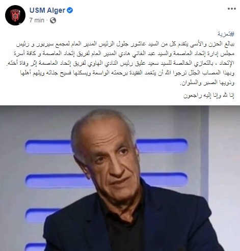 الفريق العاصمي نشر التعزية على صفحته الرسمية في الفايسبوك وعبر خلالها عن وقوف الرئيس المدير العام لمجمع سيربور “عاشور جلول” والمدير العام لسوسطارة “عبد الغاني هادي” مع عليق في هذا الظرف الصعب.