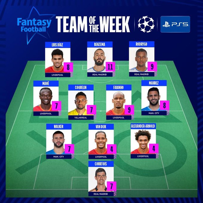 كما ضمت التشكيلة المثالية كل من كريم بن زيمة ورودريغو وساديو ماني ووالكر والحارس كورتوا.
