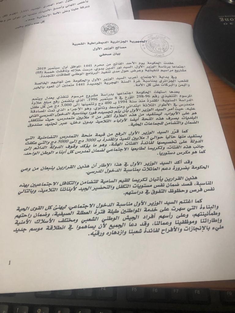 وقال بيان لمصالح الوزارة الأولى، إن الحكومة قررت إثر اجتماع للحكومة ترأسه اليوم الوزير الأول، إجراءات لفائدة التلاميذ المتمدرسين.