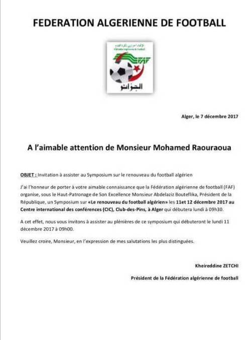 كما أن الدعوة التي تلقاها روراوة كانت عن طريق البريد الالكتروني للمكلف بالاعلام في الفاف دون امضاء رئيس الاتحادية الحالي زطشي.