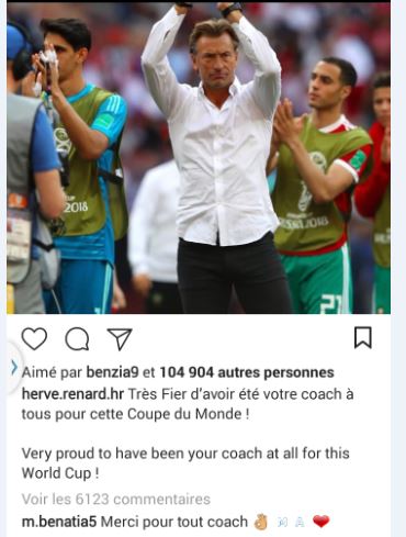 وأرفق رونار الصورة بعبارة:”كنت فخورا جدا بتدريب المنتخب  المغربي في مونديال روسيا” ليرد عليه القائد بن عطية بتعليق:”شكرا على كل شيئ كوتش”.