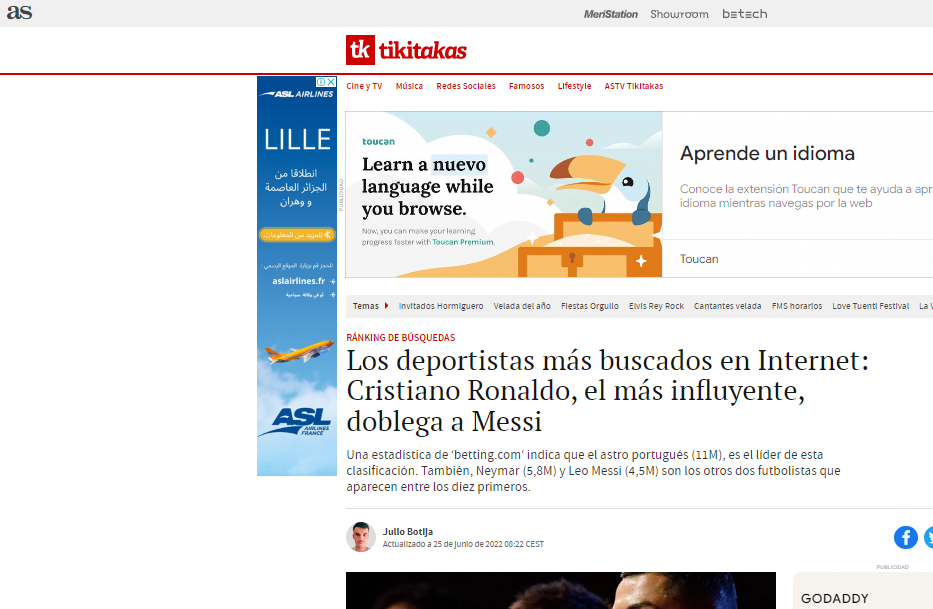وحسب إحصائيات موقعBetting  المتخصص، فإن رونالدو تم البحث عن إسمه في الأنترنت بحوالي 11 مليون مرة شهريا، متجاوزاً العديد من النجوم العالميين.