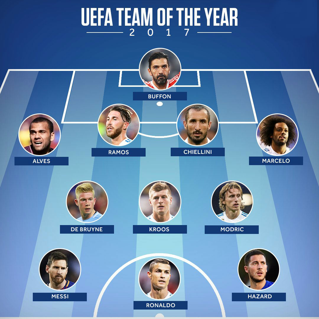 أعلن الإتحاد الأوروبي لكرة القدم عن التشكيلة المثالية لأوروبا لسنة 2017، حيث سيطر لاعبو ريال مدريد على التشكيلة بتواجد 5 أسماء كاملة يتقدمهم “كريستيانو رونالدو”.