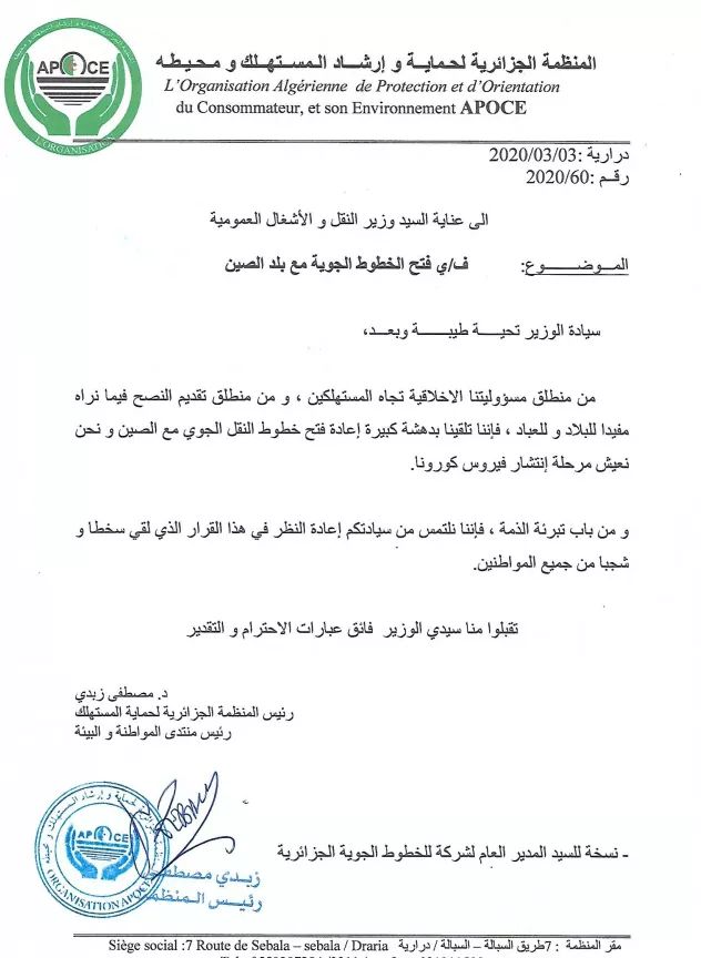 وجهت المنظمة الجزائرية لحماية وإرشاد المستهلك ومحيطه مراسلة إلى وزير الأشغال العمومية والنقل بخصوص فتح الخطوط الجوية مع الصين.