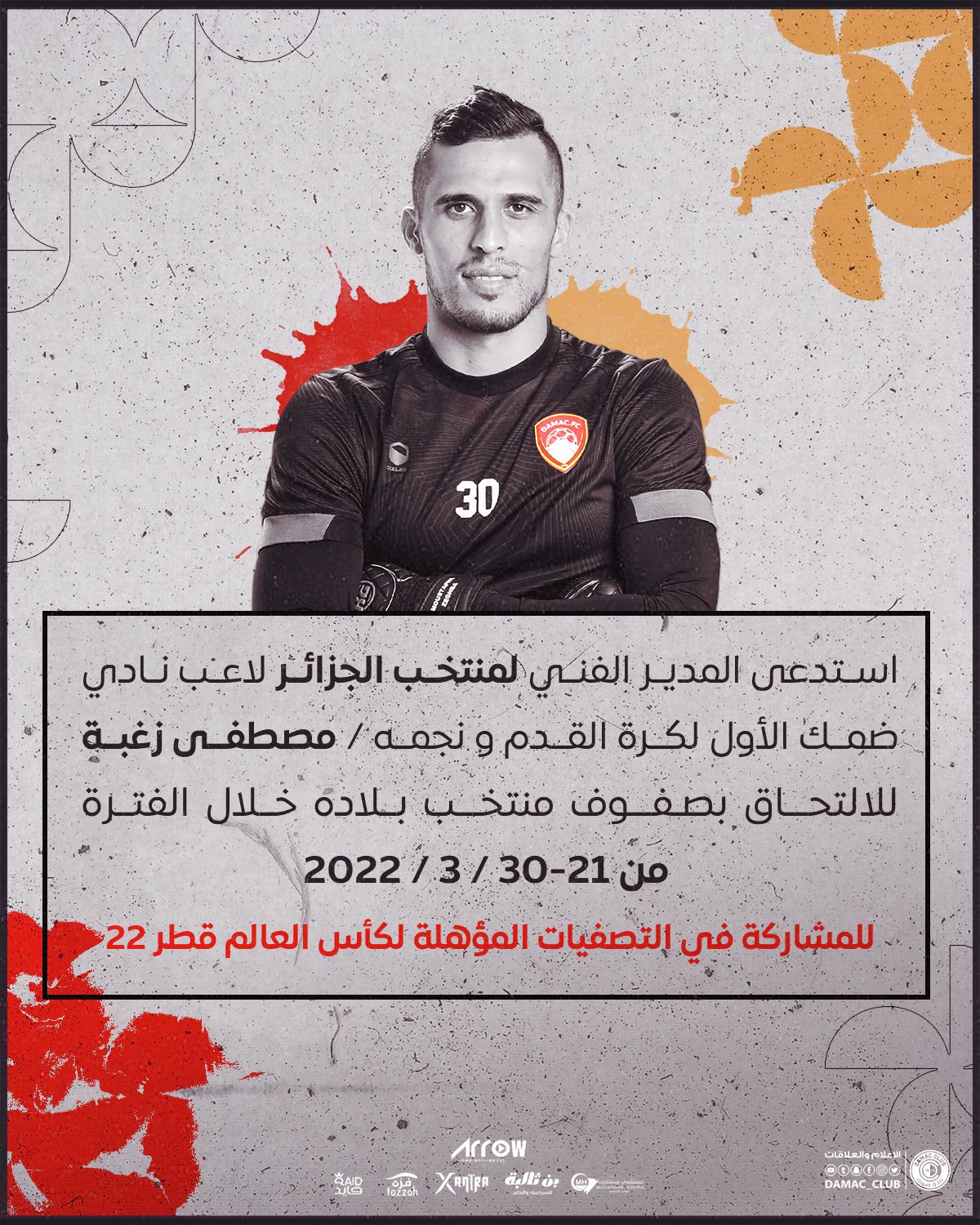 كشف نادي ضمك السعودي على الصفحة الرسمية له في “التويتر” عن تلقى الحارس مصطفى زغبة. دعوة للمشاركة في التصفيات المؤهلة للمونديال.