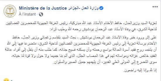 عزى وزيرالعدل حافظ الأختام، بلقاسم زغماتي، رئيس الغرفة الجهوية للمحضرين القضائيين للشرق عبد الله مباركية، في وفاة عبد الرحمان بودشيش.