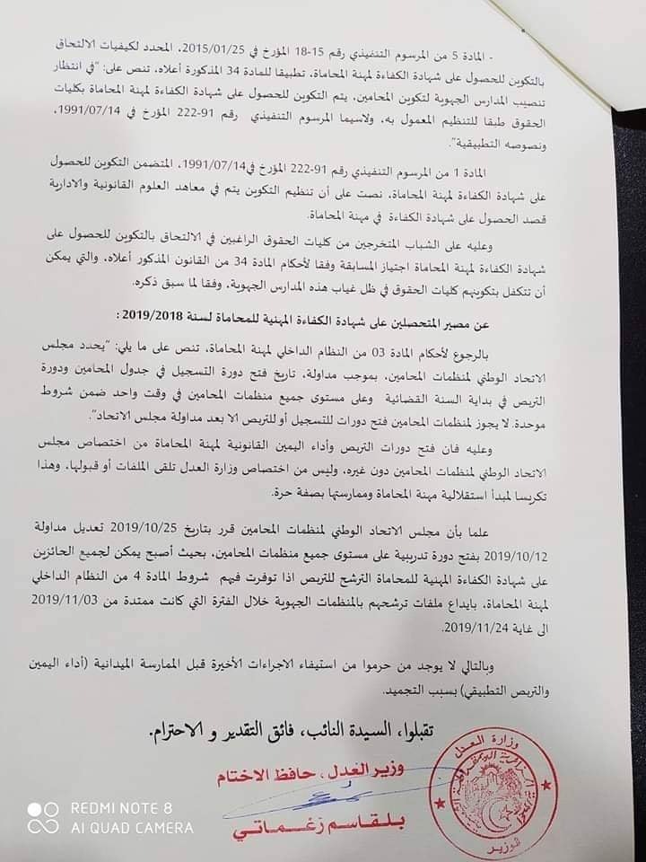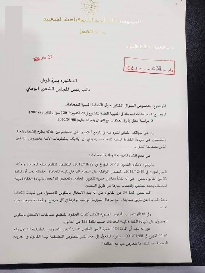 وقال زغماتي في رده على سؤال كتابي لنائب رئيس المجلس الشعبي الوطني، بدرة فروخي، أن فتح دورات للتسجيل اوالتربص من اختصاص مجلس المحاماة دون غيره وليس من اختصاص الوزارة.