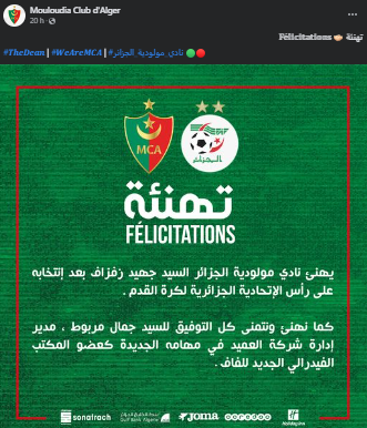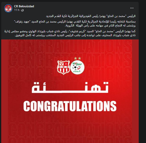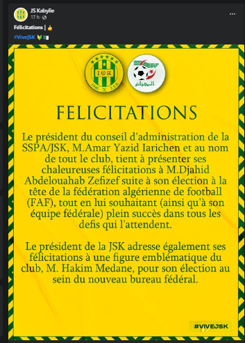 كما أبدت العديد من الأندية الأخرى تمنياتها بالتوفيق للرئيس الجديد للفاف، برسائل دعم، على غرار شبيبة القبائل، شباب بلوزداد وباقي الأندية.