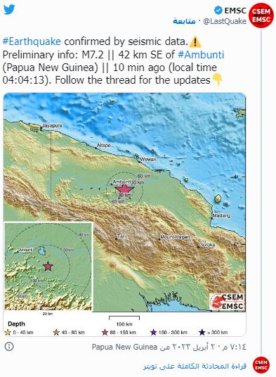 وأوضح ذات المركز أن الزلازال وقع في حدود الساعة 18:04 بالتوقيت العالمي حدد مزكزه الزلازال بـ 38 كلم من مدينة أمبونتي وعلى عمق 73 كلم.