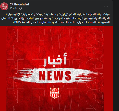 عينت لجنة التحكيم الفدرالية، الحكم زواوي لإدارة مباراة وداد تلمسان ضد شباب بلوزداد برسم الجولة 34 من الرابطة المحترفة الأولى.