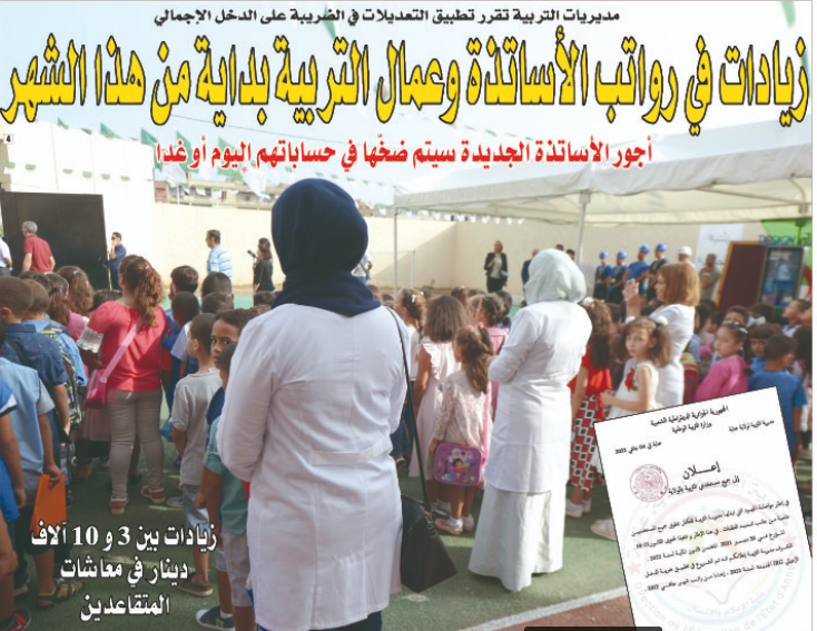 أعلنت عدد من مديريات التربية، عن زيادات معتبرة للأساتذة وعمال التربية، بداية من هذا الشهر، وهذ بعد تطبيق ضريبة الدخل الإجمالي IRG. وأكدت مديريات التربية على أنه بعد تعديل الضريبة على الدخل، الصادر في الجريدة الرسمية بتاريخ 30 ديسمبر الماضي، تطلب الأمر سحب حوالات راتب شهر جانفي من الخزينة العمومية وإعادة تعديل الراتب باحتساب الضريبة … تابع قراءة زيادات في رواتب الأساتذة وعمّال التربية بداية من هذا الشهر