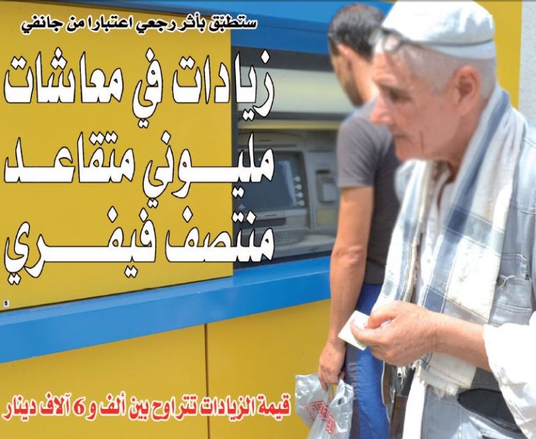 ستطبق بأثر رجعي اعتبارا من جانفي قيمة الزيادات تتراوح بين ألف و6 آلاف دينار سيستفيد مليونا متقاعد من زيادات متفاوتة في المعاشات بداية من منتصف شهر فيفري الداخل ناتجة عن مراجعة الضريبة على الدخل الإجمالي التي أقرتها الحكومة بموجب قانون المالية لسنة 2022، وهي زيادات ستمس فقط الفئة التي تزيد قيمة معاشها ثلاثين ألف دينار. … تابع قراءة زيادات في معاشات مليوني متقاعد منتصف فيفري