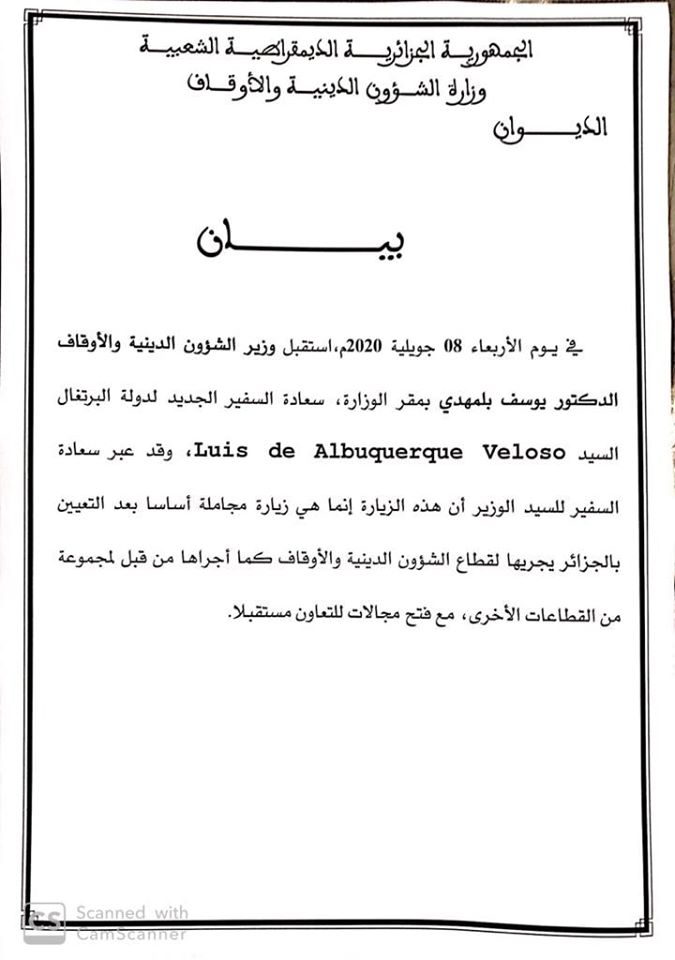 قام السفير الجديد لدولة البرتغال بالجزائر، اليوم الأربعاء، بإجراء زيارة مجاملة إلى وزير الشؤون الدينية والأوقاف يوسف بلمهدي.