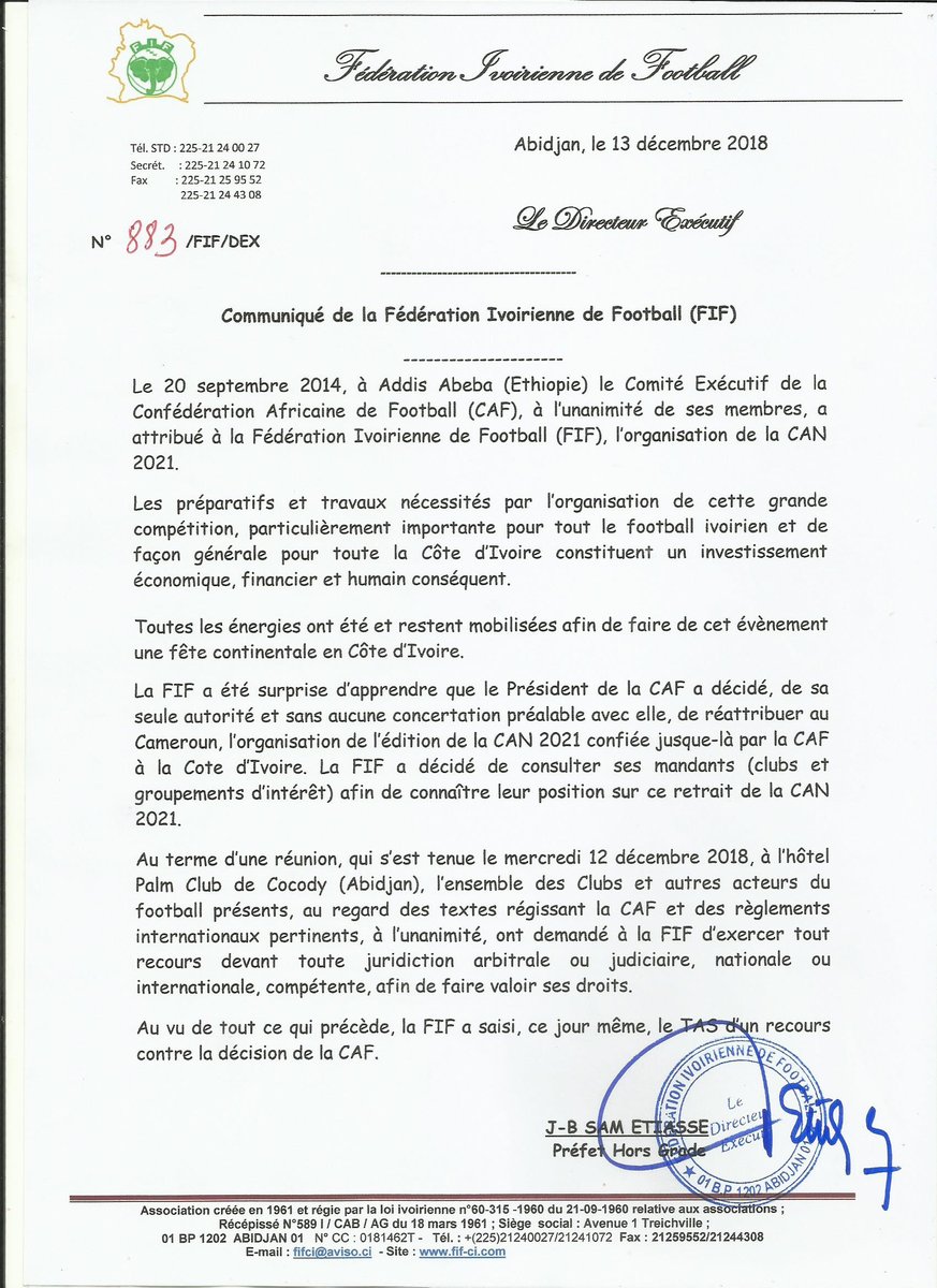 رفع الإتحاد الإيفواري لكرة القدم، شكوى إلى المحكمة الرياضية الدولية، ضد الإتحاد الإفريقي الذي سحب منها دورة 2021.