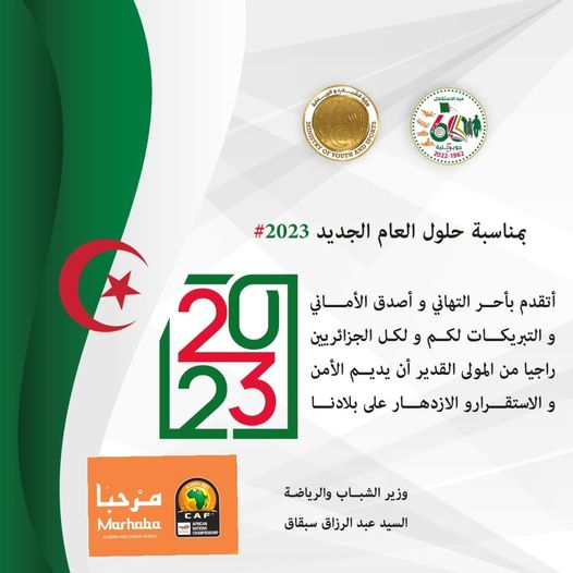 هنأت وزارة الشباب والرياضة برئاسة عبد الرزاق سبقاق الجزائريين بحلول السنة الجديدة 2023، كما تقدّمت بأحر التهاني. وأصدق الأماني و التبريكات.