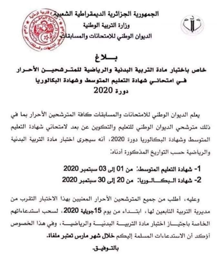 وعليه فإن المترشحين الأحرار المعنيين بهذا الإختبار  للتقرب من مديرية التربية التابعين لها لسحب إستداعاءاتهم الخاصة وذلك إبتداء من 15 جويلية.