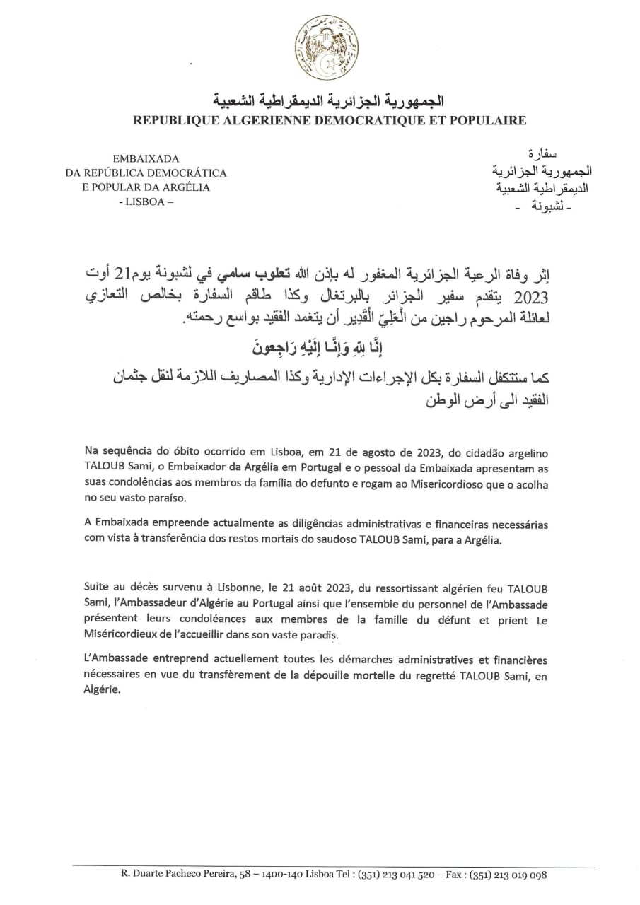 قدم سفير الجزائر بالبرتغال خالص تعازيه لعائلة المرحوم سامي تعلوب اللاعب السابق لمولودية الجزائر الذي توفى في العاصمة لشبونة.