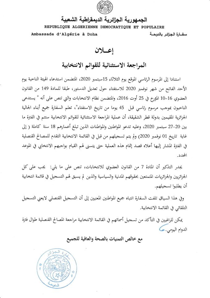 أعلنت السفارة الجزائرية في قطر ان عملية المراجعة الاستثنائية للقوائم الانتخابية ستتم في الفترة ما بين 20-27 سبتمبر 2020.