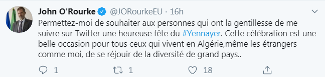 وكتب سفير الإتحاد الأوروبي بالجزائر، جون اورورك، في تغريدة له “إسمحوا لي أن أتمنى لأولئك الذين يتسمون بالرضا الكافي لاتباعي على تويتر احتفال سعيد بيناير”.