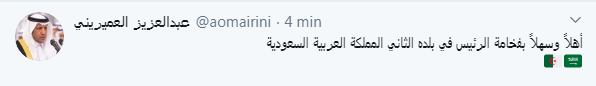 وكتب، سفير السعودية بالجزائر، عبدالعزيز العميريني، اليوم الأربعاء عبر حسابه الرسمي على التويتر، قائلا “اهلا وسهلا بفخامة الرئيس في بلده الثاني المملكة العربية السعودية”.