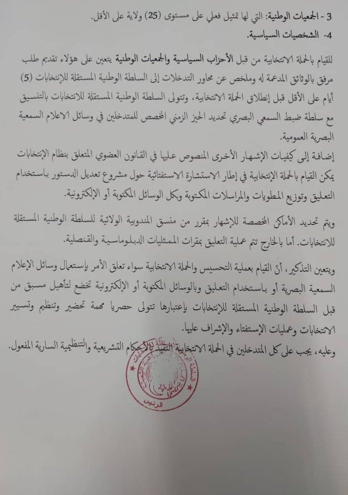 وأضاف ذات البيان، أن السلطة الوطنية ستتولى بالتنسيق مع سلطة ضبط السمعي البصري تحديد الحيّز الزمني المخصّص للمتدخلين في وسائل الإعلام المسموعة والمرئية في إطار الحملة الانتخابية.