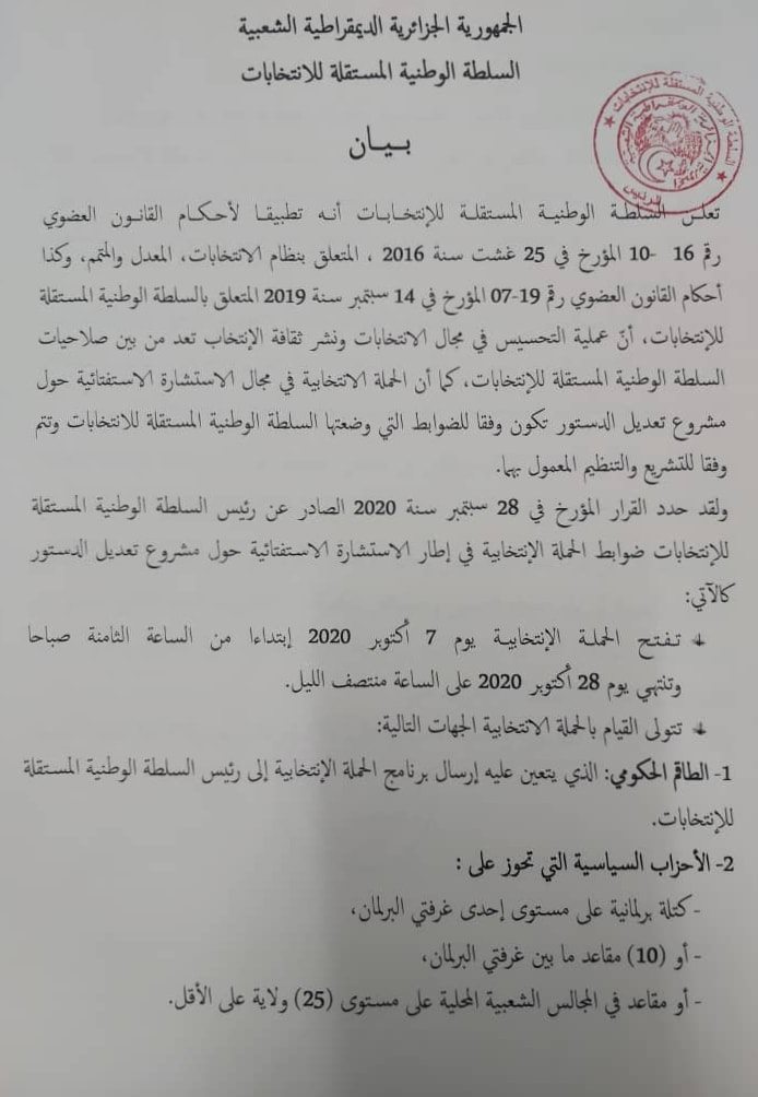 كشفت السلطة الوطنية المستقلة للانتخابات، اليوم الإثنين، عن الأطراف التي ستشارك في تنشيط الحملة الانتخابية للاستفتاء الشعبي حول تعديل الدستور.