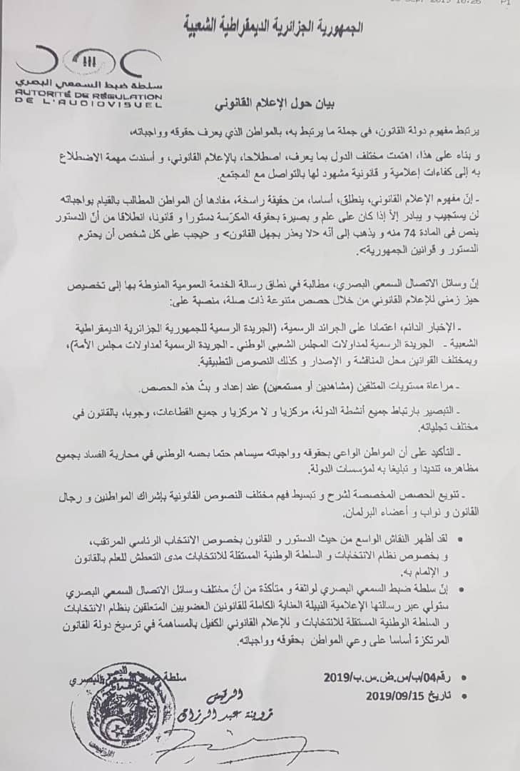 طلبت سلطة ضبط السمعي والبصري من وسائل الاتصال المسعي والبصري في نطاق الخدمة العمومية تخصيص خدمة للإعلام القانوني.