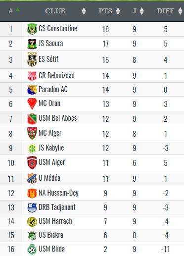 ويواصل شباب قسنطينة تصدره ترتيب الرابطة المحترفة الأولى برصيد 18 نقطة وبفارق نقطة واحدة عن ملاحقه شبيبة السباورة.