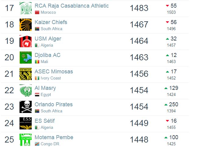 فيما حلّ وفاق سطيف الثاني في الجزائر وفي المركز 407 عالميا و24 إفريقيا، متبوعا بشبيبة الساورة 548 عالميا و41 إفريقيا.