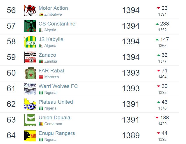 فيما جاءت الاندية الجزائرية الأخرى خارج قائمة أفضل 50 ناديا على المستوى الإفريقي كشباب قسنطينة 57، شبيبة القبائل 58، ومولودية الجزائر 69.