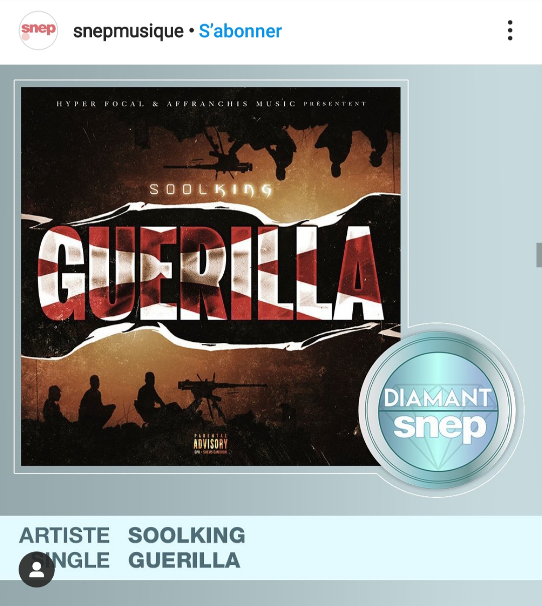 وأعلنت شركة “Snep Musique” الفرنسية، عن هذا التتويج الذي حققته أغنية “Guérilla”، وذلك لتحميلها لأزيد من 50 مليون عبر تطبيقات تحميل الموسيقى.