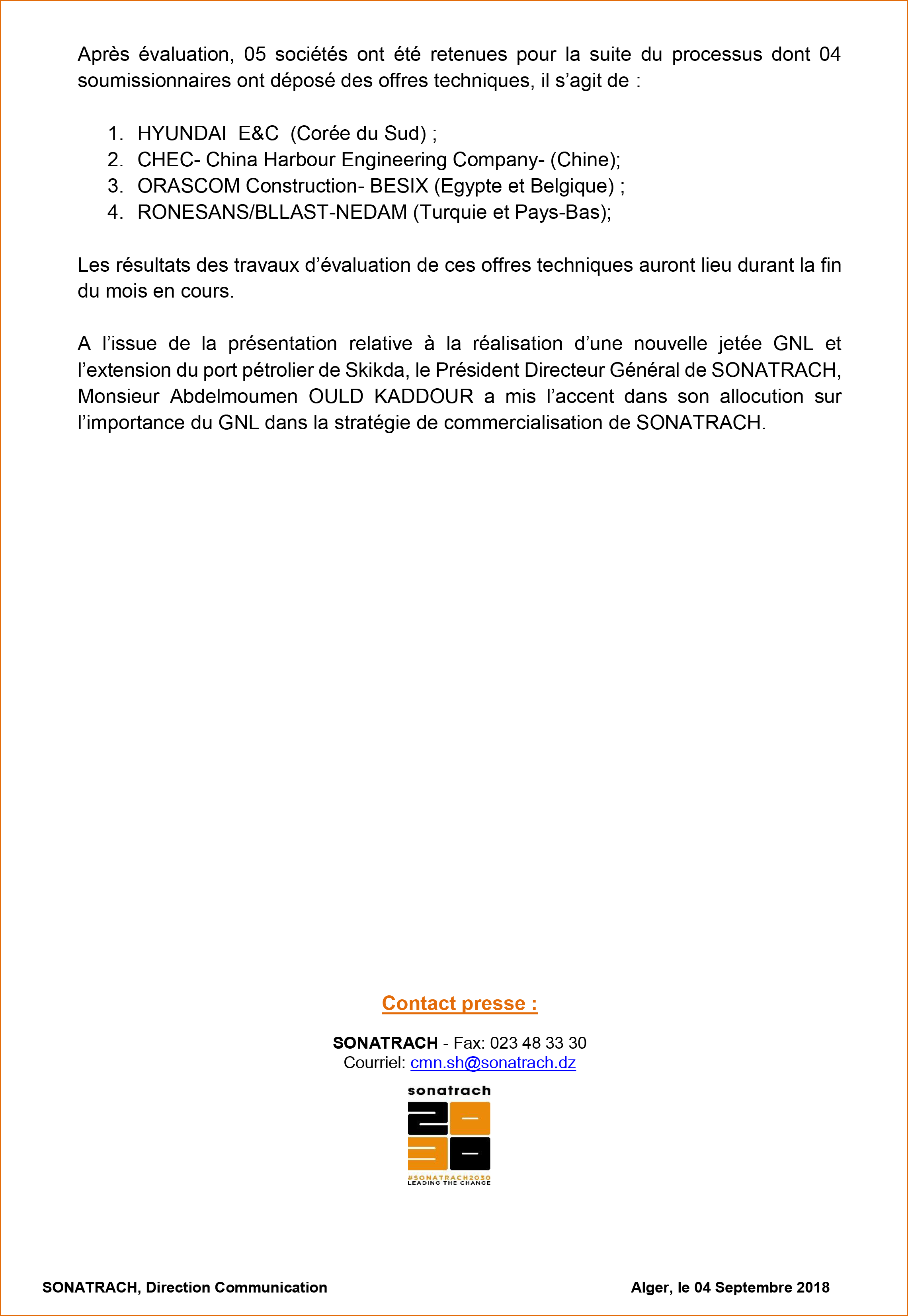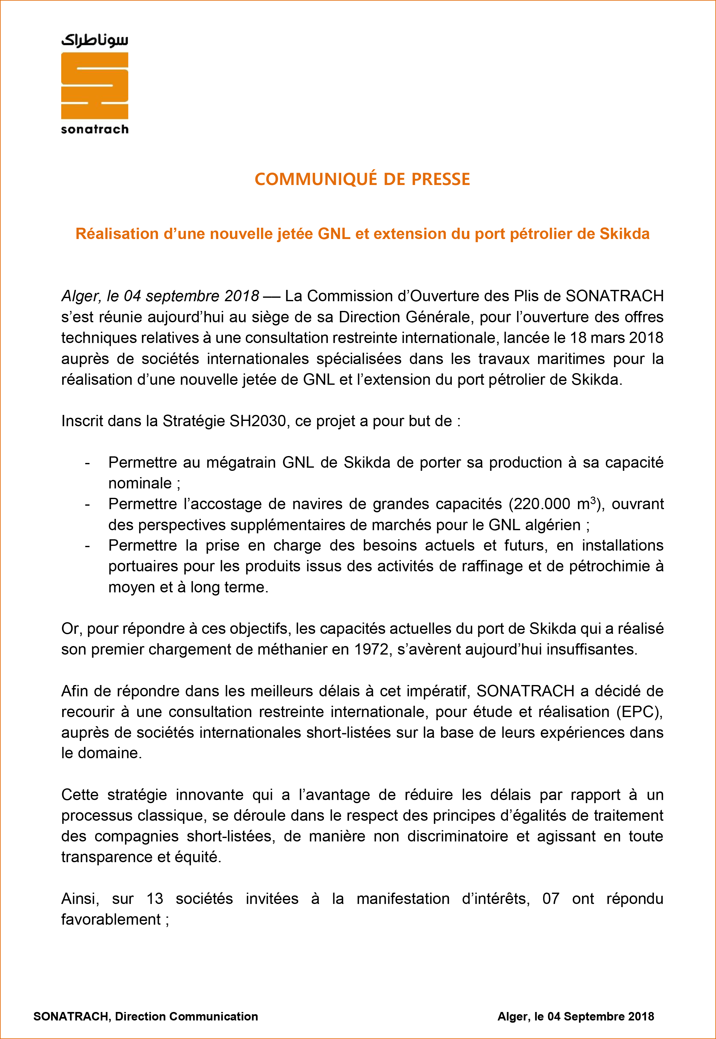 وقالت سوناطراك في بيان لها أن المناقصة تم إطلاقها في 18 مارس 2018 من الشركات العالمية المتخصصة في الأعمال البحرية.
