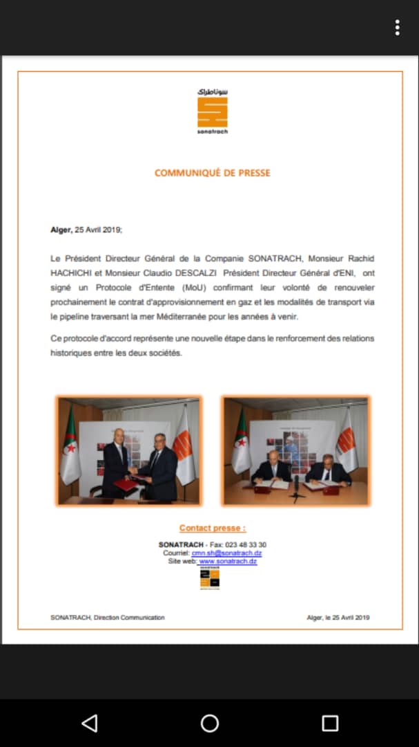 وحسب بيان لـ” سوناطراك” ، فقد وقّع رئيس المدير العام لشركة “سوناطراك” رشيد حشيشي، و الممثل عن شركة “ايني” الايطالية،  كلوديو ديسكالي، على “مذكرة تفاهم، تؤكد استعدادهم لتجديد عقد إمداد الغاز قريبًا ،  عبر خط الأنابيب الذي يعبر البحر الأبيض المتوسط ​​للسنوات القادمة “.