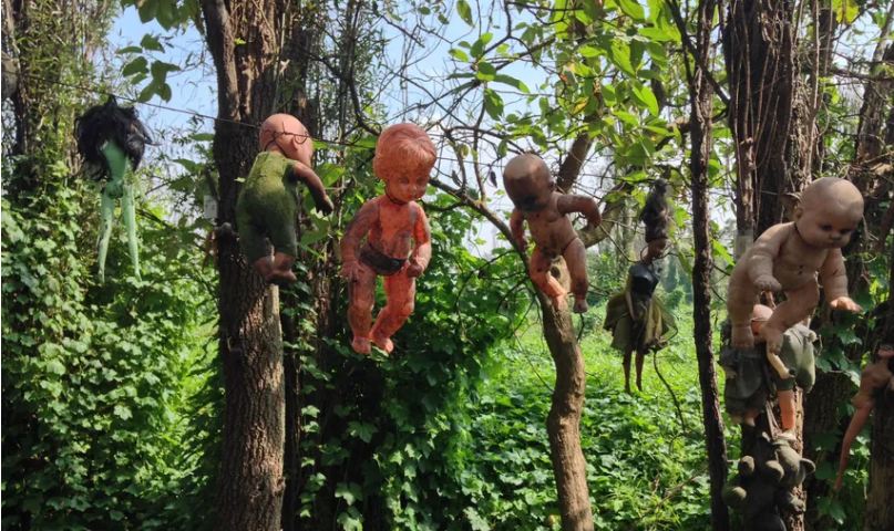 تتدلى من أغصان هذه الجزيرة المشجرة بكثافة آلاف الدمى في حالات مختلفة من الملابس والانحلال.