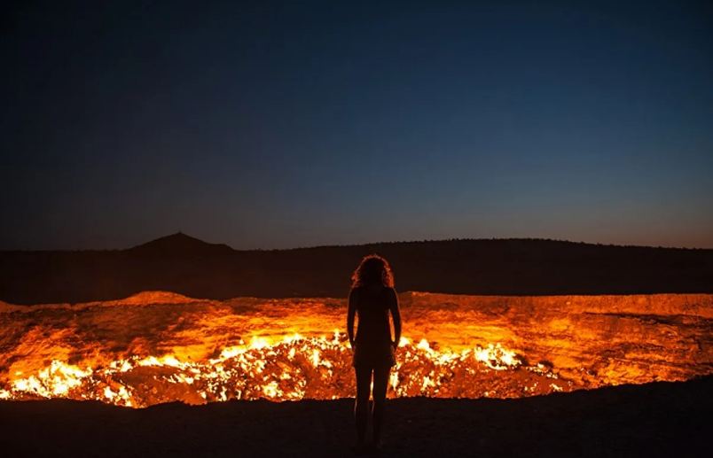 المخرج في صحراء كاراكوم في تركمانستان يكمن في “بوابات الجحيم” التي تحمل اسمًا مشؤومًا ولكن مناسبًا. حفرة ضخمة مشتعلة في الرمال، مظهرها المذهل لا ينافسه إلا أصولها الغامضة.