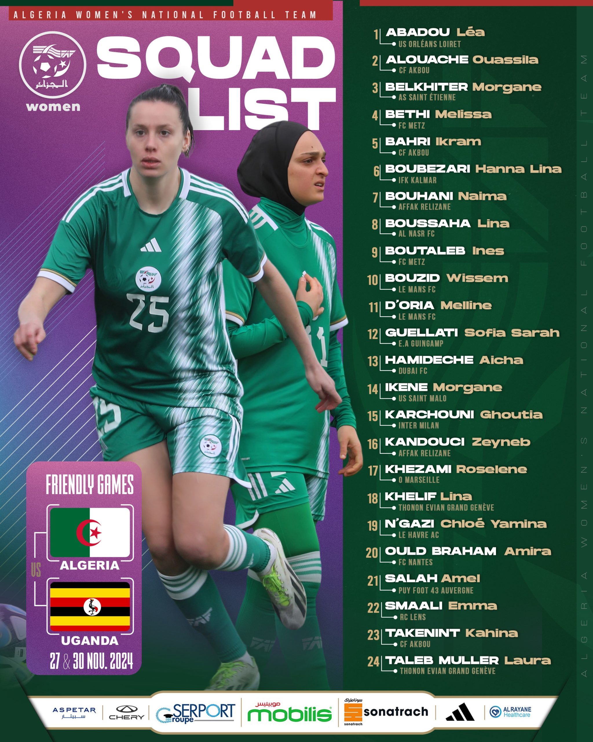 ووجّه الناخب الوطني فريد بن ستيتي، الدعوة لـ24 لاعبة، للمشاركة في هذا التربص، الذي ستتخلله مبارتين تحضيريتين أمام سيدات منتخب أوغندا.