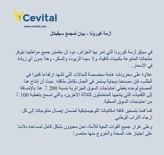 وأكد المجمع، أن مصنع سيفيتال في بجاية يستمر في العمل بكامل طاقته، ويغطي احتياجات السوق الجزائرية 200 بالمائة.