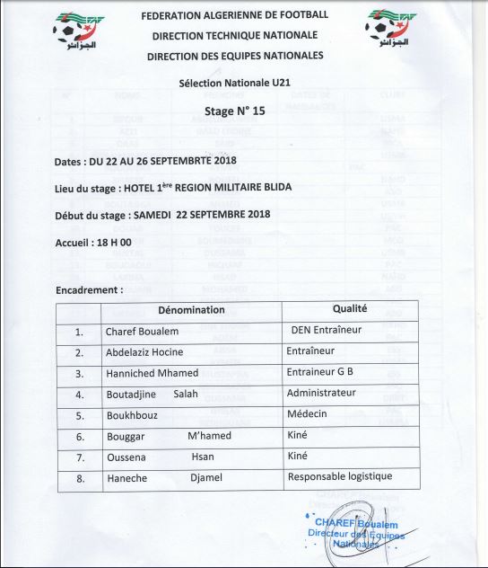 ونشر الموقع الرسمي للإتحاد الجزائري لكرة القدم، قائمة اللاعبين المعنيين بهذا التربص، المقرر اجراؤه بفندق الجيش بالبليدة، مابين 22 إلى 26 سبتمبر الجاري.