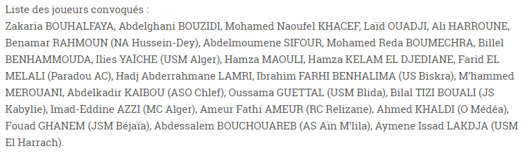 أعلن الطاقم الفني للخضر لأقل من 21 سنة بقيادة، بوعلام شارف، عن قائمة الـ 25 لاعبا الذين سيخوضون تربصا في سيدي موسى من 18 الى 22 نوفمبر المقبل.