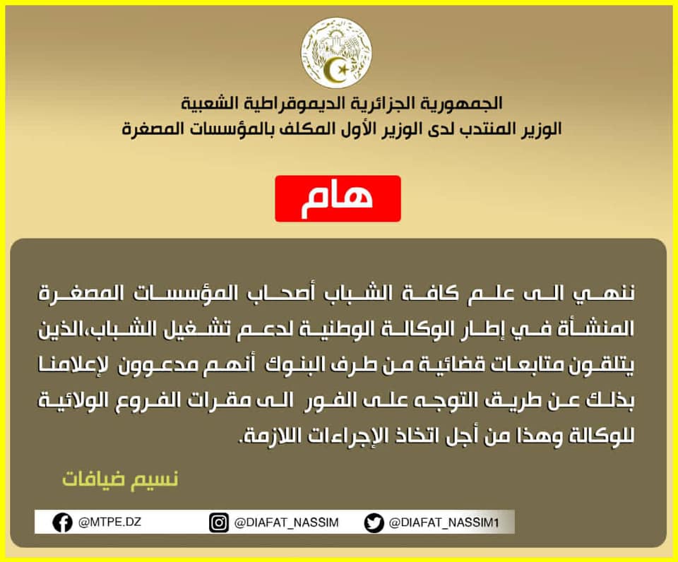 وجاء في بيان الوزارة:” إنّ أصحاب المؤسسات المصغرة المنشأة في إطار الوكالة الوطنية لدعم تشغيل الشباب، والمتابعين قضائيا، من طرف البنوك، انهم مدعوون للإعلامنا بذلك.”
