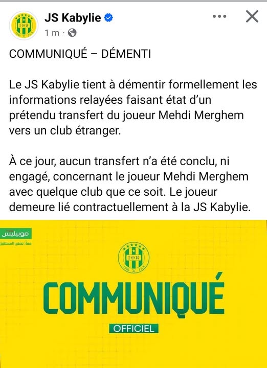 وأوضحت إدارة النادي، في بيان نشرته اليوم الاثنين، أنه لم يتم الشروع أو إتمام أي صفقة انتقال تخص اللاعب مهدي مرغم، إلى أي نادٍ على الإطلاق، مؤكدة في الوقت ذاته أن اللاعب لا يزال مرتبطًا بعقد رسمي مع نادي شبيبة القبائل.