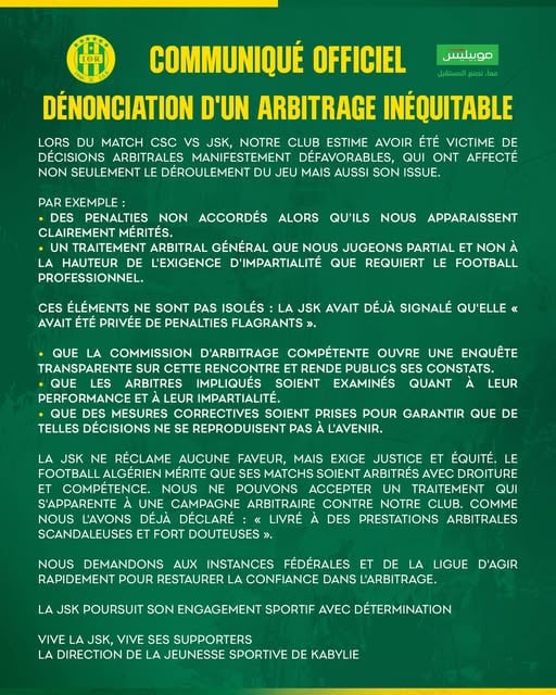 أصدرت إدارة شبيبة القبائل بياناً رسمياً عقب المباراة التي جمعت الفريق بشباب قسنطينة، اليوم الأحد، ضمن الجولة الـ11 من الرابطة المحترفة، وانتهت بفوز النادي القسنطيني بهدف دون رد بملعب الشهيد محمد حملاوي.